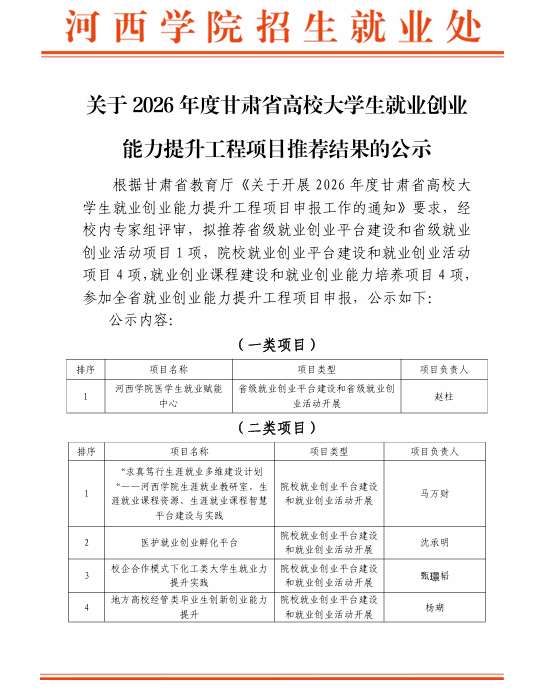 关于2026年度甘肃省高校大学生就业创业能力提升工程项目推荐结果的公示