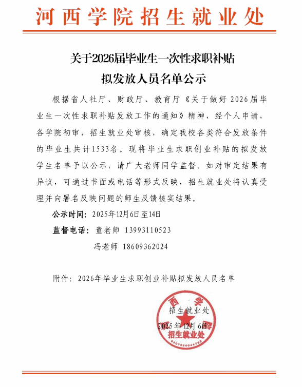 关于2026届毕业生一次性求职补贴拟发放人员名单公示