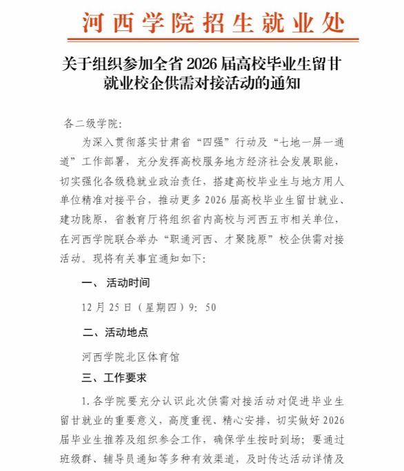 关于组织参加全省2026届高校毕业生留甘就业校企供需对接活动的通知
